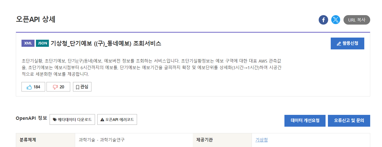 3. 해당 서비스의 '활용신청' 버튼 클릭